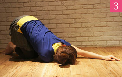 両ヒザを揃えて四つんばいになり、足のつま先を立てたら息を吐きながらお尻をかかとの上に。