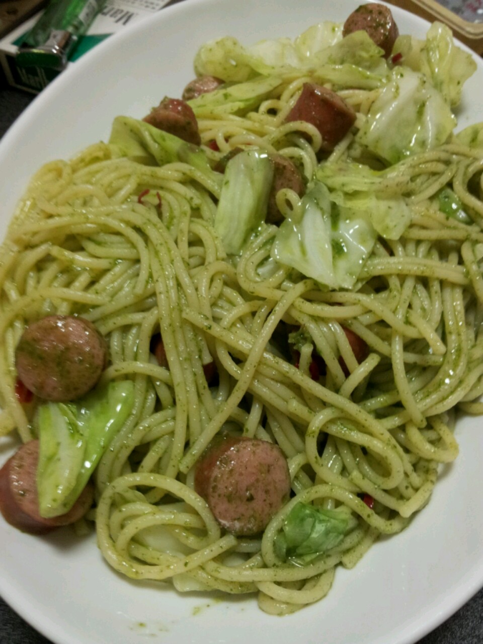 お次にバジルをペースト状にして、鷹の爪を加えたバジルぺペロンチーのパスタ★