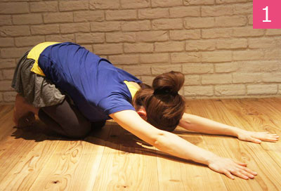 両ヒザを揃えて四つんばいになり、足のつま先を立てたら息を吐きながらお尻をかかとの上に。